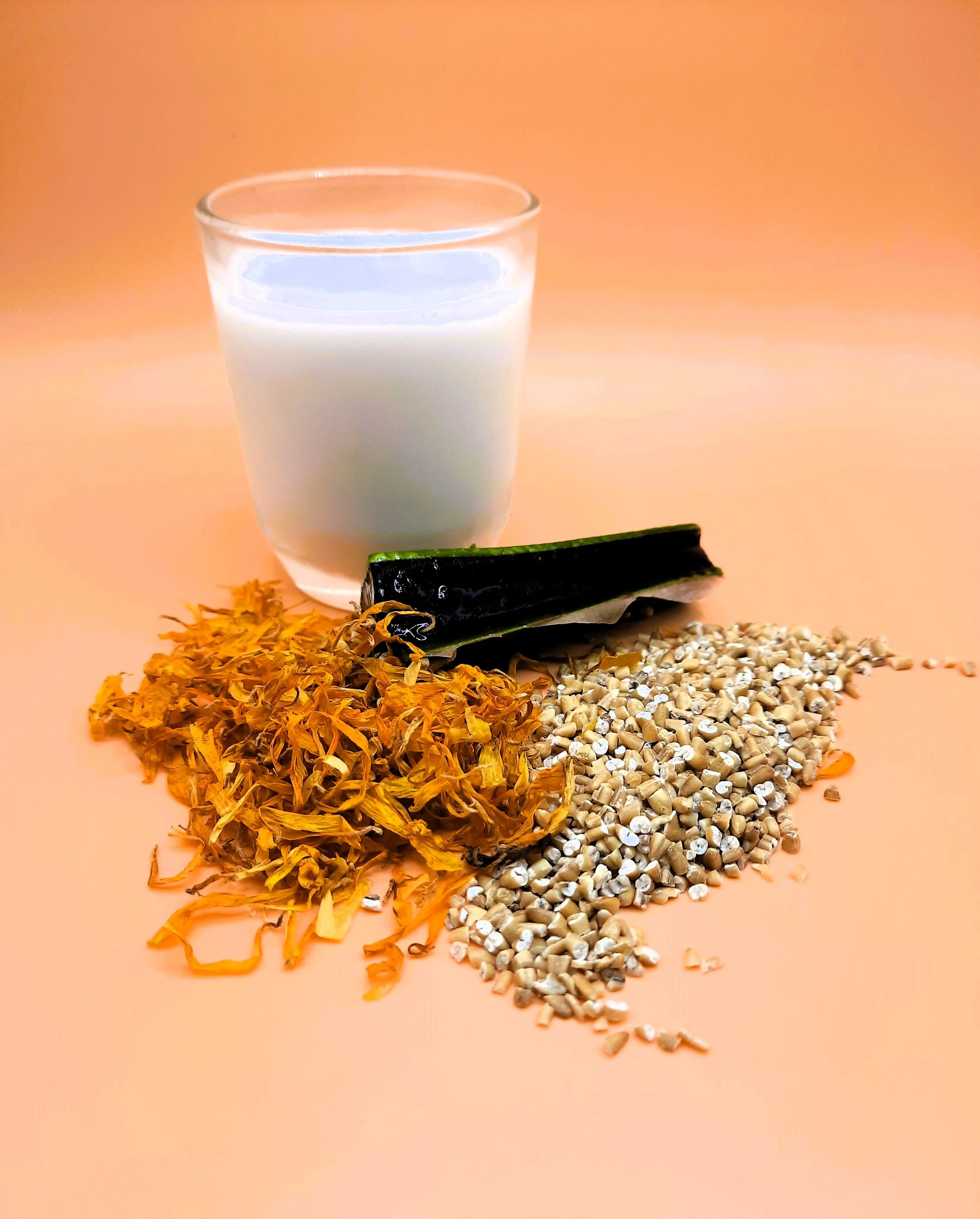 Whole milk powder, oat powder, baking soda (sodium bicarbonate), aloe vera powder, calendula essential oil
